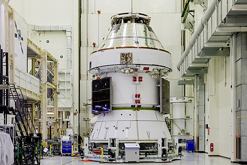 Here we can see, Integrity, the cone-like Orion Crew Module for the next Artemis mission sitting on top of the cylindrical European Service Module. Taken in March 2025, two of its four long solar panel arrays used to help provide electricity (the dark squares) can be seen folded against side of the ESM.