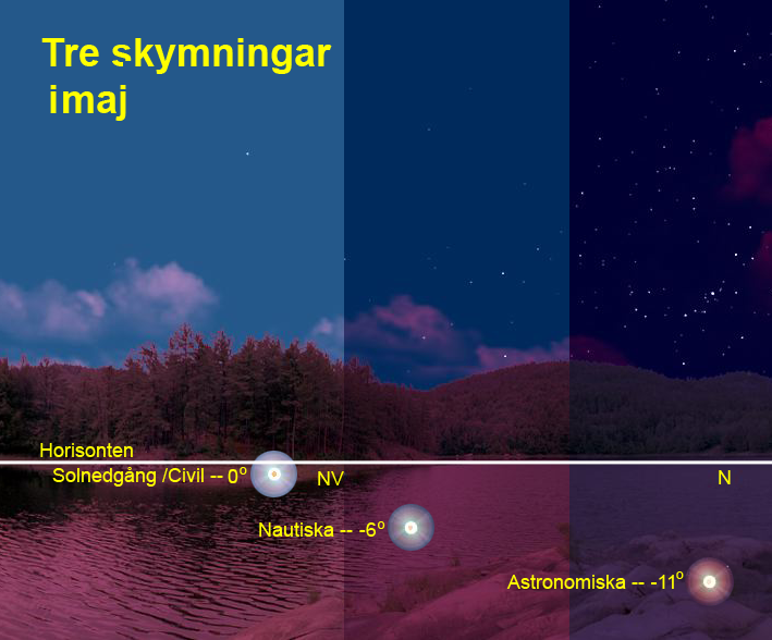 Ta en titt på illustrationen ovan som visar alla dessa tre olika skymningar. Du ser inte bara solens position i förhållande till horisonten, utan du får också ett konstnärligt intryck av hur natthimlen ser ut. (Bild: Tom Callen)