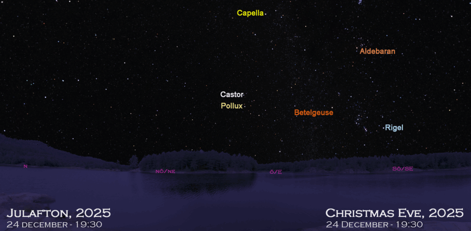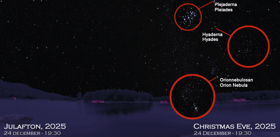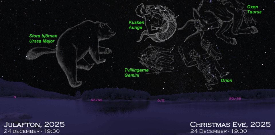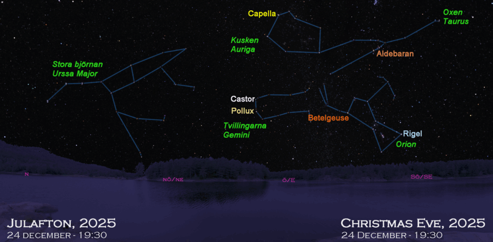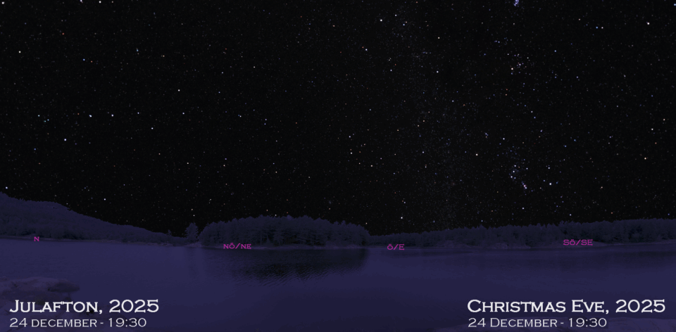 Mitt i den milda vintern 2025 kommer, som förra året, förslaget att gå ut och njuta av natthimlen tillsammans! Kartorna här är aktuella för julaftonskvällen i år, men om det inte är klart väder där du bor, kan du använda samma kartor några veckor in i januari. Kom ihåg att titta tidigare varje kväll för att stjärnhimlen ska stämma med kartan.