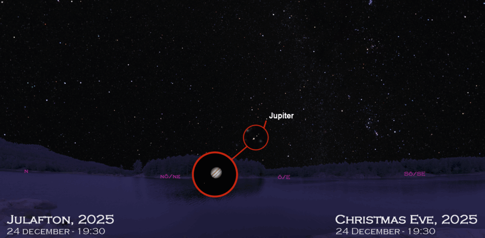 Om vi fokuserar på vad som annars kan ses klockan 19:30 på julafton, finns det bara en planet att observera. Jupiter är vitgul till färgen och lyser starkare än stjärnorna i Tvillingarna runt omkring den. Du vet att du har hittat Jupiter eftersom den, jämfört med stjärnorna, inte blinkar utan lyser med ett stadigt sken. Om du har en kikare, kan du passa på att titta på Jupiter, den största planeten i vårt solsystem. Håll kikaren riktigt stilla – luta dig exempelvis mot en dörrkarm eller taket på en bil – och stå helt stilla. Kan du se något som ser ut som små stjärnor i linje med Jupiters ekvator? Det är planetens största månar, och det visas också här på den mindre cirkelmarkerade bilden. Klockan 19:30 kan du kanske se tre av de fyra månarna, som först upptäcktes av Galileo Galilei med ett hemmagjort teleskop 1610. Den större cirkeln visar Jupiter som den kan se ut genom ett amatörteleskop med högre förstoring än en kikare och inkluderar en av dessa fyra månar, som ses som den lilla ”stjärnan” till vänster om planeten.