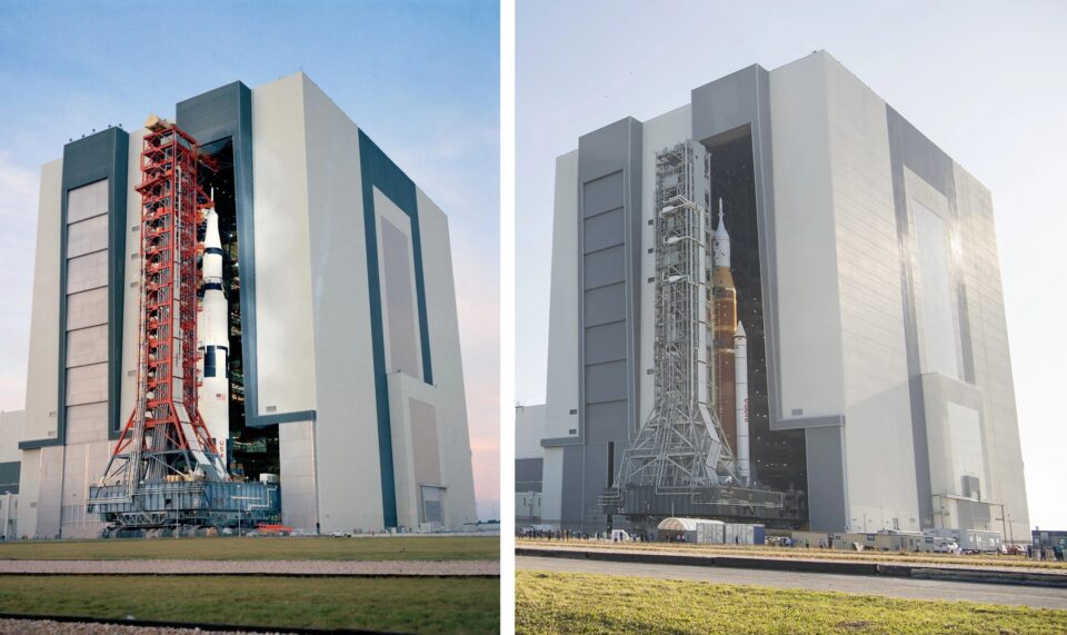 Nu när jag har nämnt VAB är det ett bra tillfälle att jämföra storleken på de ursprungliga månraketerna, Saturn V, med dagens Space Launch System. Byggnaden där de monteras är fortfarande densamma, men raketerna själva är olika. Den som skickade astronauter till månen för över ett halvt sekel sedan (till vänster) är en enda, fristående stapel, rak som en metersticka. SLS, å andra sidan, har två extra SRB (Solid Rocket Boosters), fastspända på sidorna av den orangefärgade huvudtanken för flytande bränsle i raketens centrum. Om de ser bekanta ut är det för att de liknar dem som användes i NASAs rymdfärjeflotta. Istället för flytande bränsle är dessa två tätt packade med fast drivmedel.